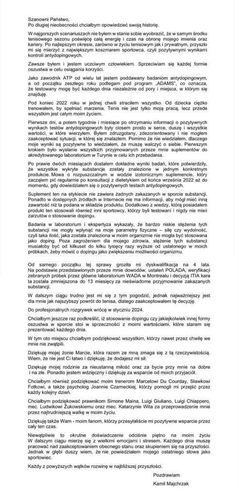 Zawieszenie polskiego tenisisty od 30 listopada 2022 roku - zakończy się 29 grudnia 2023 roku. 27-latek obecnie jest 218. zawodnikiem świata. 23 października wypadnie z klasyfikacji. Będzie musiał budować ranking od nowa. Wróci na kort w styczniu 2024 roku.