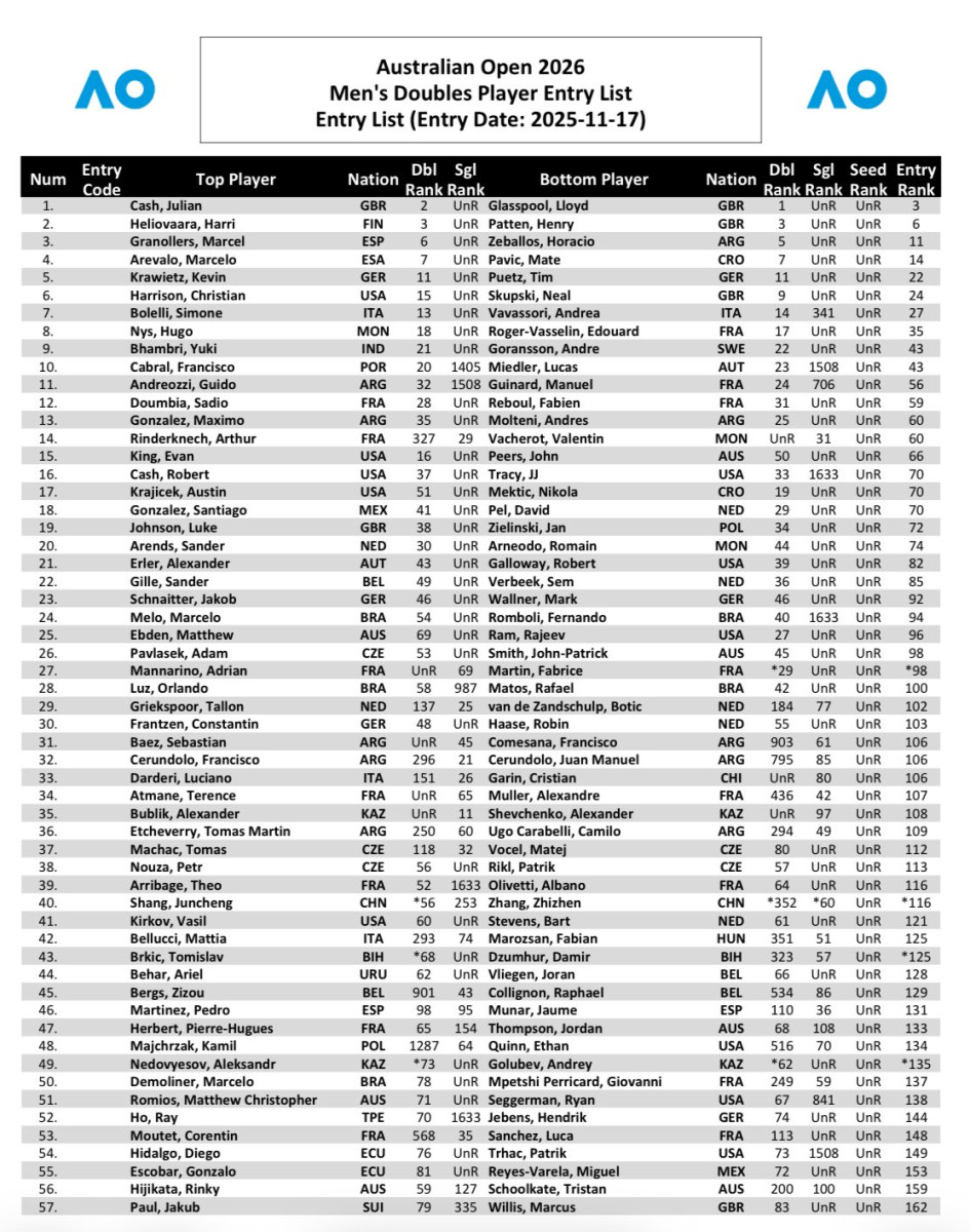 Zieliński stworzy duet z Brytyjczykiem Luke'm Johnsonem, z którym będzie grał w 2026 roku. Partnerem deblowym Majchrzaka w australijskim szlemie będzie Amerykanin Ethan Quinn.