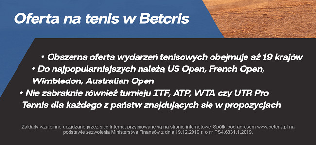 Nie ma wątpliwości, że jednym z najważniejszych elementów, na który należy zwrócić uwagę, jest oferta tenisowa. Betcris dopiero wystartował w Polsce, jednak widać, że firma odpowiednio przygotowała się do tego startu. W ofercie tenisowej znajduje się naprawdę sporo rozszerzeń. Dodatkowo możliwe jest skorzystanie z zakładów na mniej popularne turnieje, co na polskim rynku wcale nie jest standardem.