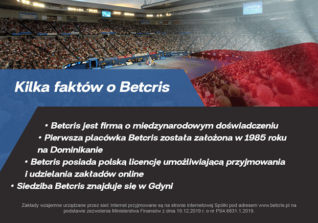 Zakłady wzajemne urządzane przez sieć Internet przyjmowane są na stronie internetowej Spółki pod adresem www.betcris.pl na podstawie zezwolenia Ministerstwa Finansów z dnia 19.12.2019 r. o nr PS4.6831.1.2019.