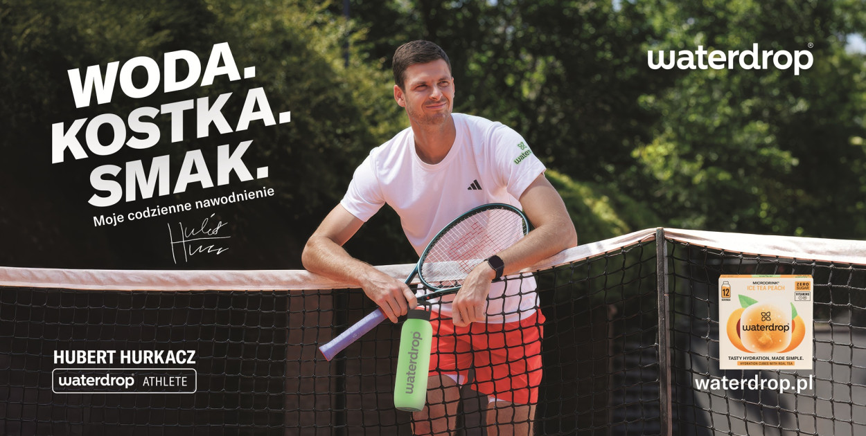 Hubert Hurkacz na billboardach w największych miastach Polski zachęca do picia wody na co dzień. Kampania Waterdrop z hasłem „Moje codzienne nawodnienie” pokazuje, że małe, konsekwentne wybory mogą mieć duże znaczenie - zarówno dla zdrowia, jak i dla planety. Prawie połowa Polaków pije za mało wody, bo nie pamięta o regularnym nawodnieniu, a ponad ⅓ nie lubi jej smaku. Wielkoformatowe billboardy z wizerunkiem tenisisty pojawiły się w kluczowych punktach komunikacyjnych Warszawy, Krakowa, Poznania i Wrocławia oraz przy trasie ekspresowej S7.