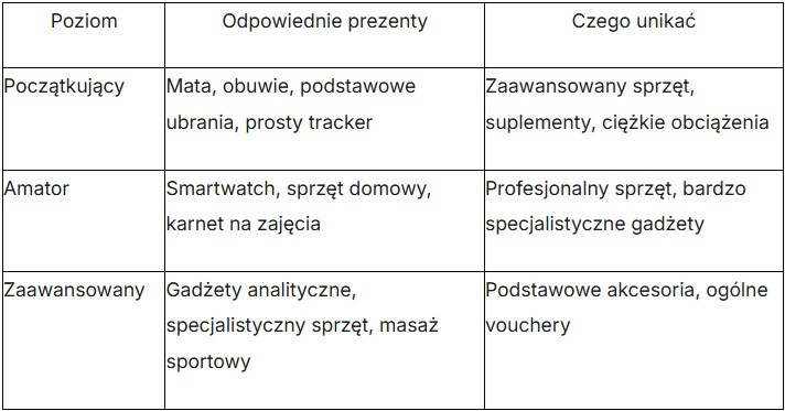 Najczęstszy błąd to kupowanie rzeczy, które już posiadają. Drugi smartwatch czy trzecia mata nie wzbudzą entuzjazmu. Nie zakładaj, że wszyscy chcą tej samej dyscypliny sportu. Sprzęt do biegania dla miłośnika jogi to pudło. Nie przesadzaj z rozmiarem - gigantyczny worek treningowy w małym mieszkaniu to kłopot.