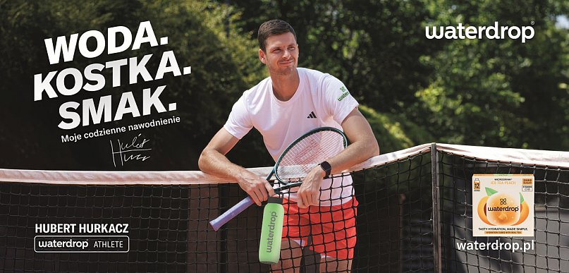Hubert Hurkacz na billboardach w największych miastach Polski zachęca do picia wody na co dzień. Kampania Waterdrop z hasłem „Moje codzienne nawodnienie” pokazuje, że małe, konsekwentne wybory mogą mieć duże znaczenie - zarówno dla zdrowia, jak i dla planety. Prawie połowa Polaków pije za mało wody, bo nie pamięta o regularnym nawodnieniu, a ponad ⅓ nie lubi jej smaku. Wielkoformatowe billboardy z wizerunkiem tenisisty pojawiły się w kluczowych punktach komunikacyjnych Warszawy, Krakowa, Poznania i Wrocławia oraz przy trasie ekspresowej S7.